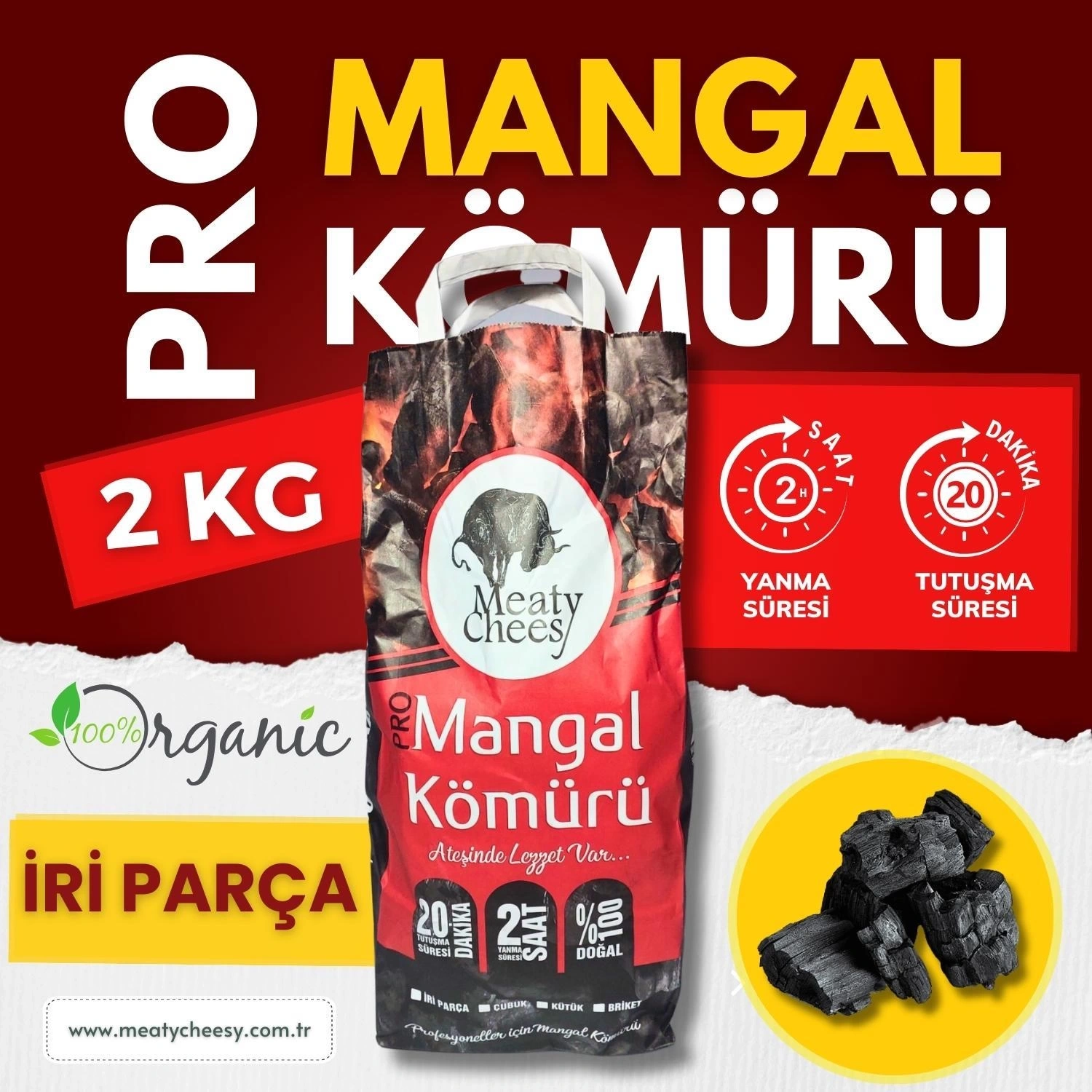 Meaty&Cheesy Prime Bio Karbon kömür, uzun süren 7100cal - 7300cal sıcaklığı ile etlerin daha iyi mühürlenmesini, suyunu hapsetmesini ve daha lezzetli olmasını sağlar. Kömürün ete bıraktığı lezzetli aroma, barbekü ve mangal keyfinizi arttırır.
