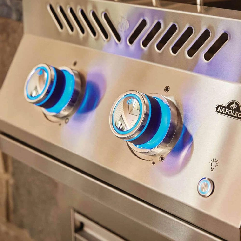 Built-In 700 Serisi gazlı mangalla entegre kullanıldığında düğmeler arkadan aydınlatmalıdır: mavi ışık ambiyans sağlar, brülör açıkken kırmızıya döner.* Böylece yanlışlıkla açık brülör bırakma riskini azaltır.