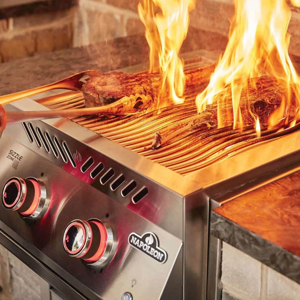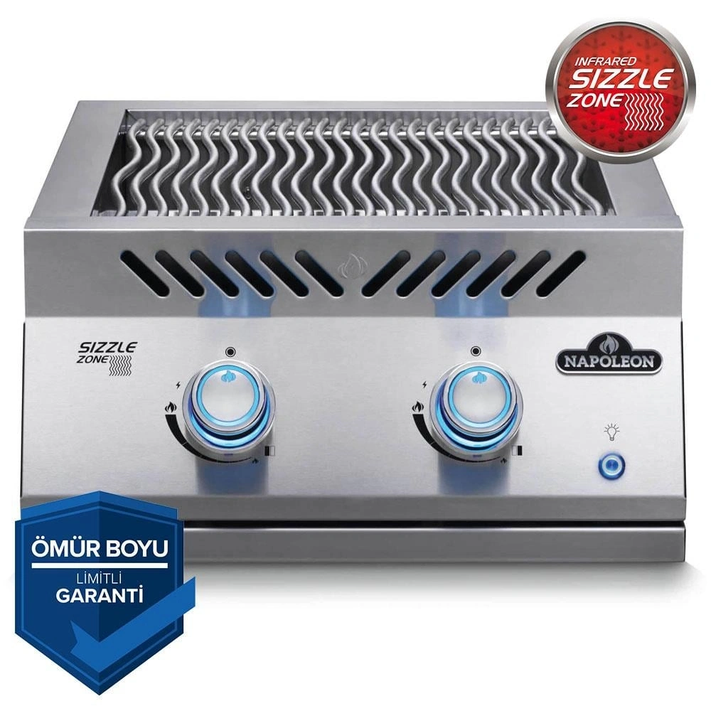 İkili Kızılötesi SIZZLE ZONE™ ile çok yüksek ısıda mühürleme yapmak ve aynı zamanda barbekünüz çalışırken garnitür/sos hazırlamak veya büyük tencerelerde su kaynatmak için dış mekân mutfağınıza eklenen ikili ocak istasyonudur.