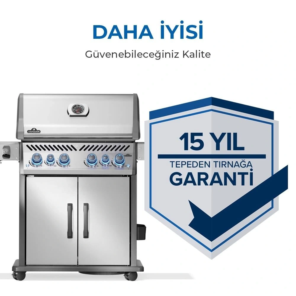 | 15 YIL TEPEDEN TIRNAĞA GARANTİ Napoleon kalitesine o kadar güveniyor ki, Rogue Pro S gazlı barbekülerinde üretim hatalarına karşı 15 yıl tepeden tırnağa garanti sunuyor. |