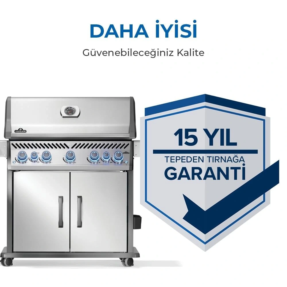 | 15 YIL TEPEDEN TIRNAĞA GARANTİ Napoleon kalitesine o kadar güveniyor ki, Rogue Pro S gazlı barbekülerinde üretim hatalarına karşı 15 yıl tepeden tırnağa garanti sunuyor. |